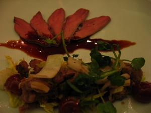 The duck did arrive shortly thereafter, with a fan of rosy breast slices flanking a row of deep fried duck livers nestled in a salad of cabbage, watercress, endive, chewy chunks of pancetta, and pickled sour cherries. The cherries caught me by surprise with their pungency, but once I knew what I was dealing with, I really enjoyed the contrast they made to the richness of the fried livers and the gentle meatiness of the breast. Tallasiandude thought they were a bit much, but I really dug 'em.