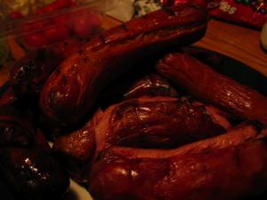 The ones we did eat were awesome. My favorite was the Hungarian wieners with garlic and paprika -- they were juicy and savory with all those spices. The smoked Italians were a big hit with partygoers, and they *were* rather good, just a touch smoky on top of the usual Italian spices. I ended up somehow with an extra five pound box of the veal brats, so it's a good thing they are tasty, mild, white li'l guys. And the fresh brats cooked in beer disappeared in the blink of an eye. Garlic knockwurst and chive-studded bockwursts, just as good as last year.